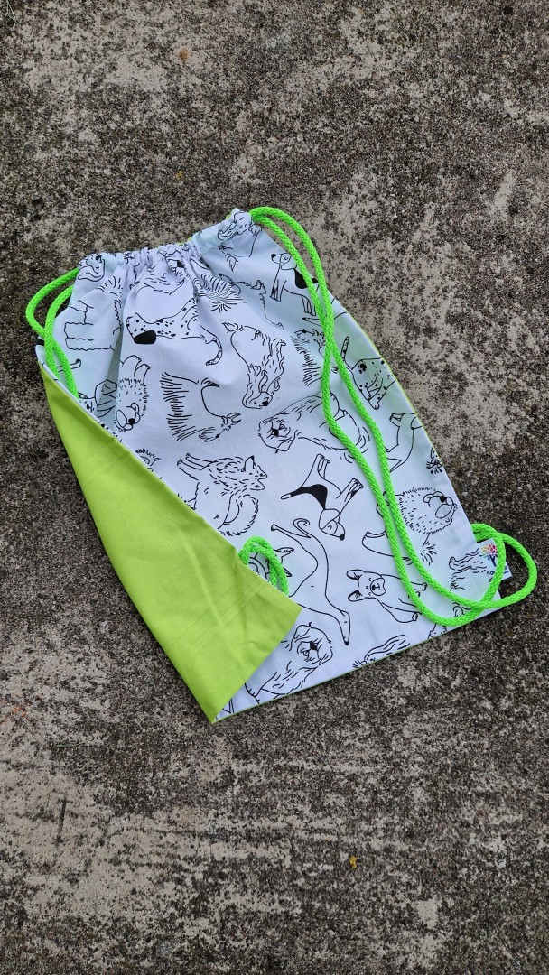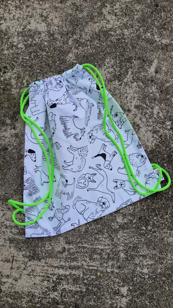 Originální malovací batůžek se stahováním na šňůrky. Z jedné strany je černobílá látka s potiskem, který lze libovolně vybarvit fixami na textil.