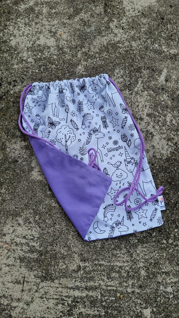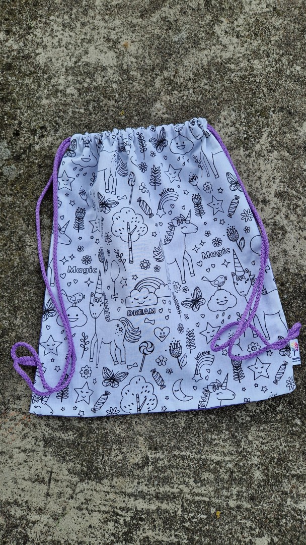 Originální malovací batůžek se stahováním na šňůrky. Z jedné strany je černobílá látka s potiskem, který lze libovolně vybarvit fixami na textil.