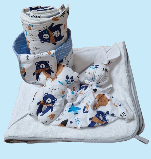 Náš set obsahuje oboustranný textilní košík, osušku s kapucí, přebalovací nepropustnou podložku, bryndáček a samozřejmě usínáčka :-)