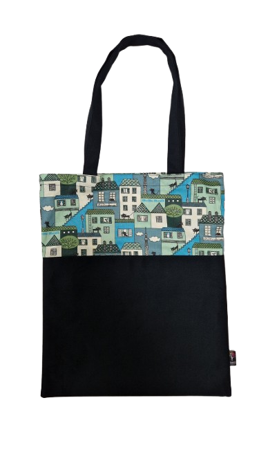 Naše nejprodávanější taška je ušita z černé, pevné režné látky v kombinaci s barevným vzorem, kterou lze nosit v ruce i přes rameno. Výrobek je ze 100 % bavlny s vyšší gramáží. Je dostatečně velká a pevná, hodí se tedy i na vetší a těžší nákupy :-)