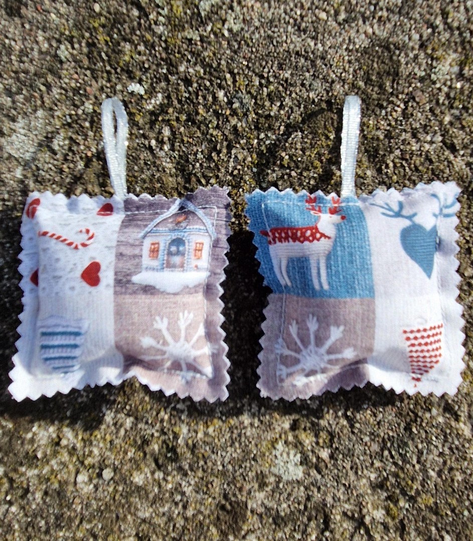 Originální vánoční ozdoby na zavěšení - čtverečky plněné směsí voňavého koření (skořice, hřebíček, badyán).